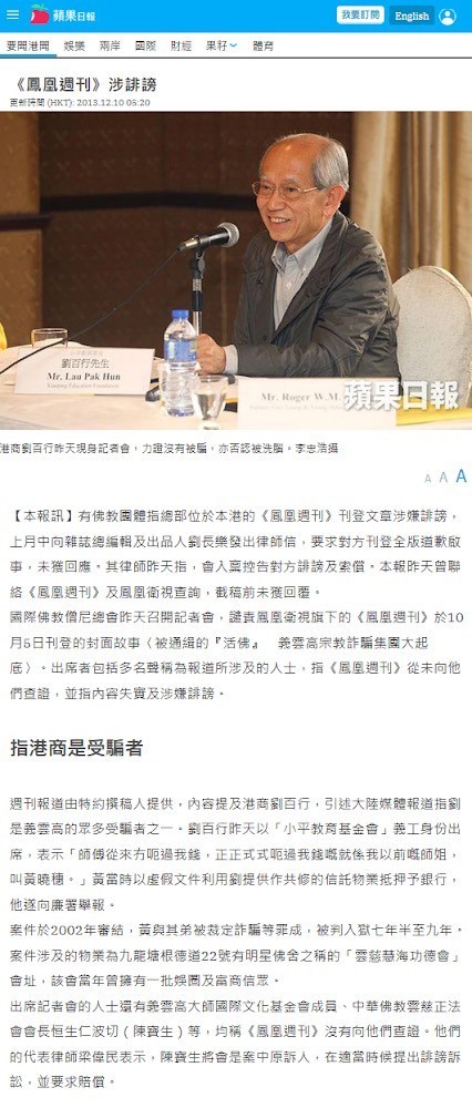 周刊报道由特约撰稿人提供,内容提及港商刘百行,引述大陆媒体报道指刘是义云高的众多受骗者之一。刘百行昨天以「小平教育基金会」义工身份出席,表示「师傅从来冇呃过我钱,正正式式呃过我钱嘅就系我以前嘅师姐,叫黄晓穗。」黄当时以虚假文件利用刘提供作共修的信托物业抵押予银行,他遂向廉署举报。